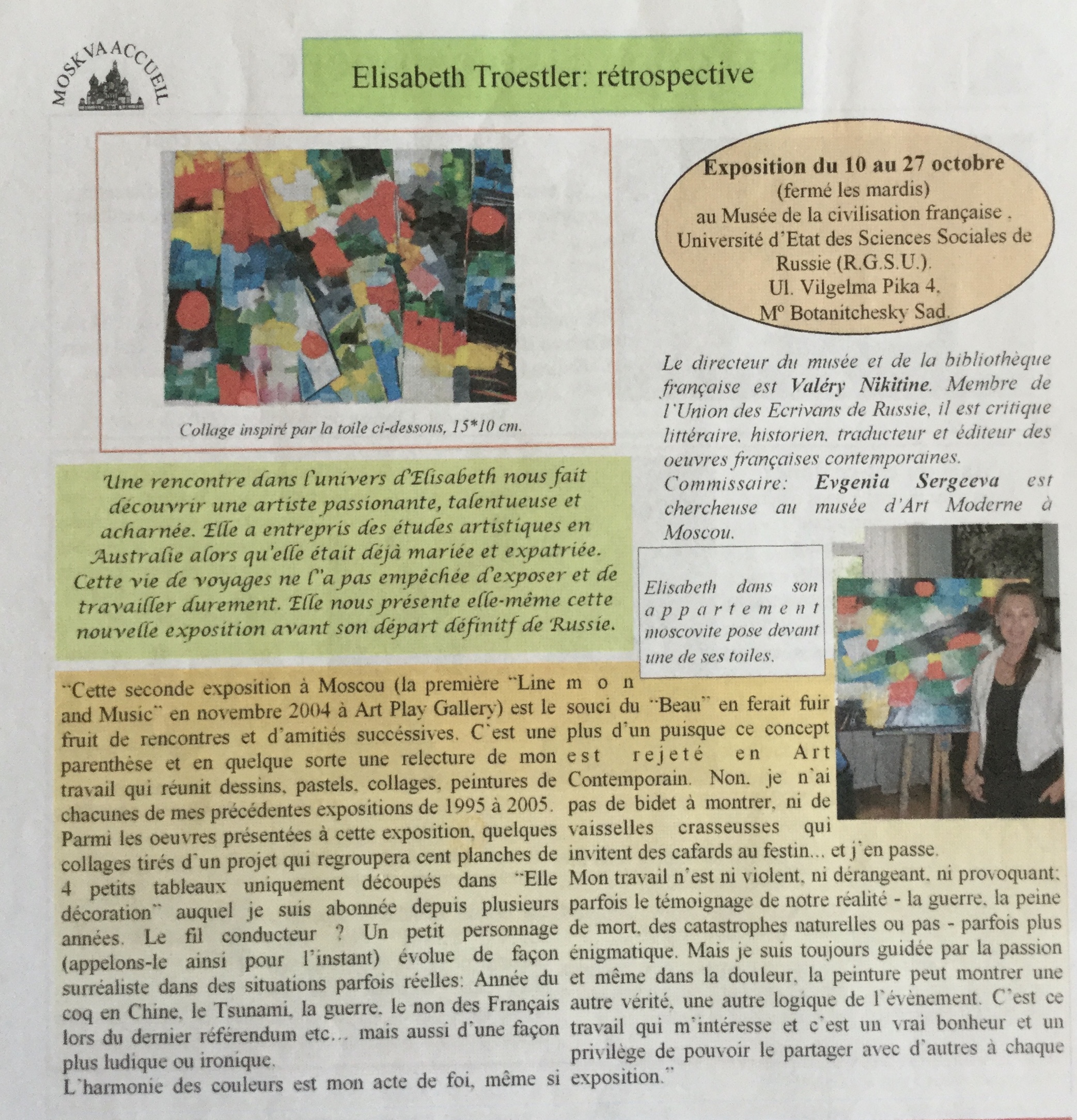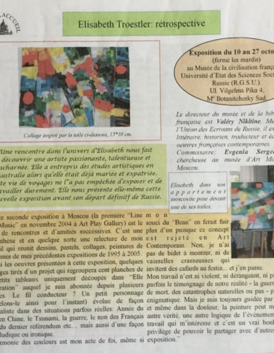 Une rétrospective de mon travail (1990-2005) a été organisée en 2005 au Musée de la Civilisation Française à Moscou par Evguenia Sergueeva du Musée d’Art Moderne de Moscou.